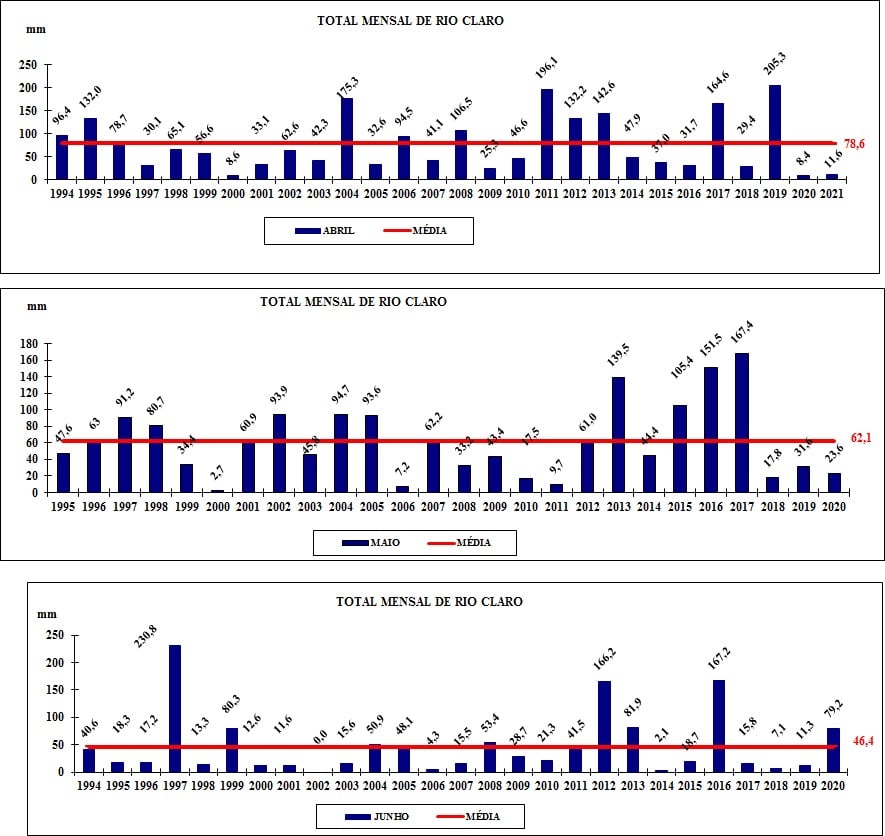 A última chuva ocorreu em 13 de maio com 7,5 milímetros de volume, sendo, até então, o acumulado para o mês. A média esperada para maio é de 62,1mm. Desde 2018, segundo medições da Estação Ceapla Unesp/Prefeitura de Rio Claro, o volume tem ficado abaixo do esperado.