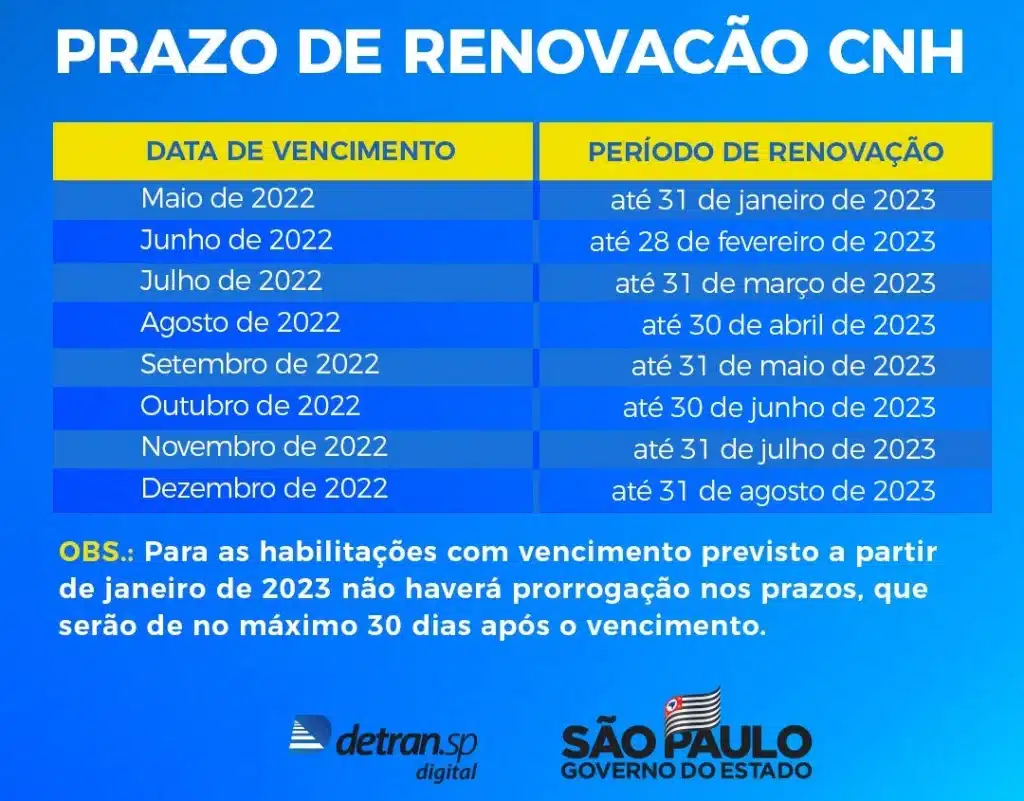 Importante lembrar que, a partir de agora, condutores que estão com o vencimento da CNH previsto para 1º de janeiro de 2023 em diante precisam seguir o cronograma habitual, conforme consta em cada documento. Ou seja, quem tem a habilitação válida até janeiro deste ano deve renovar em, no máximo, 30 dias após seu vencimento. O mesmo pode ser feito nos 30 dias que antecedem a validade impressa na carteira de motorista.