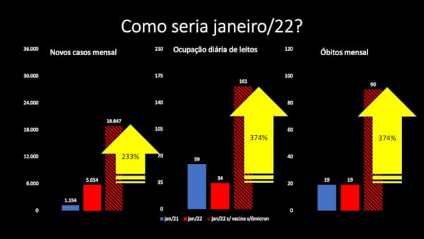 De acordo com o pesquisador, se não fosse o avanço da vacinação combinada com uma variante menos feroz, Rio Claro teria batido outros recordes. “Vacinas protegem cerca de 70% contra hospitalizações e óbitos pela Ômicron e 30% contra novas infecções. Sem a vacinação teríamos 18.847 casos em janeiro, com 161 leitos ocupados por dia e 90 óbitos”, alerta o cientista.