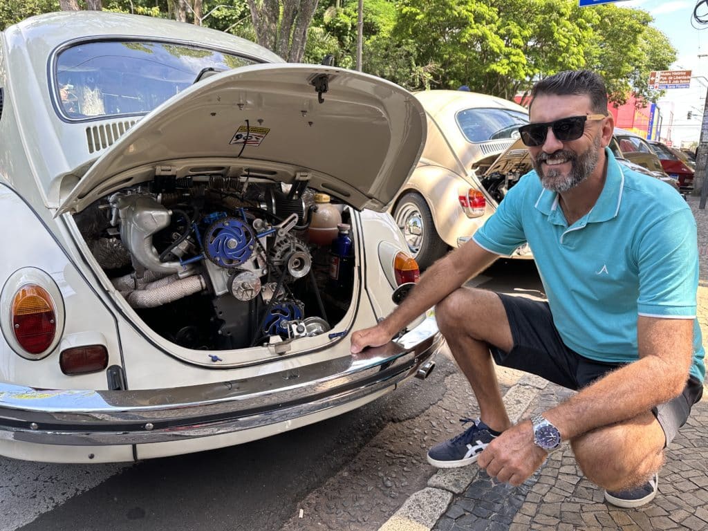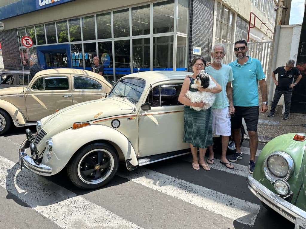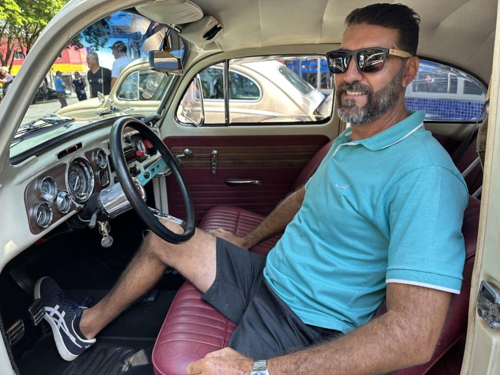 O fusca branco foi comprado em 1974 por Luiz Carlos Godoy, anos depois presenteou o filho Fabrício com o veículo. “Meu pai tirou zero km aqui na concessionária da Volkswagem, quando eu tinha de quatorze para quinze anos, eu passei no Senai daqui de Rio Claro e de presente meu pai deu o carro pra mim, como uma forma de gratidão, e eu tenho o carro até hoje”, relata o comerciante Fabrício Ricardo Godoy.
