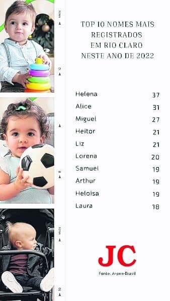 A maioria dos bebês que nasceram este ano em Rio Claro recebeu nomes semelhantes. Helena e Miguel se tornaram preferência entre as famílias rio-clarenses em 2022. De acordo com o levantamento do Jornal Cidade em dados catalogados pelos cartórios brasileiros que integram o Portal da Transparência do Registro Civil, administrado pela Arpen-Brasil, os nomes representam 37 meninas que se chamam Helena e 27 meninos que se chamam Miguel e que nasceram na cidade no período.