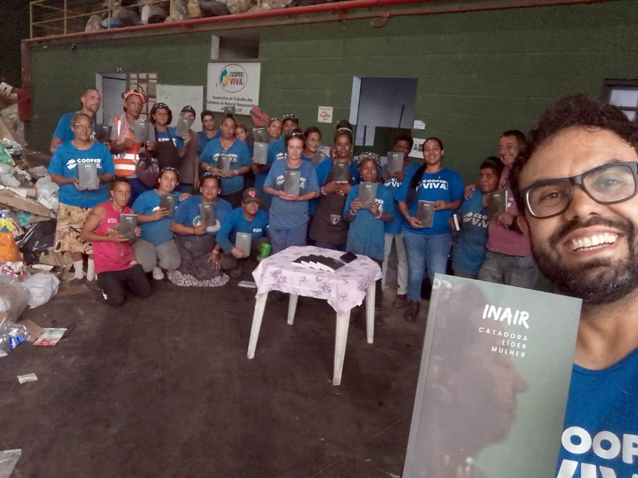 “Com profundo respeito à família, sobretudo aos filhos e à filha, apresento a primeira versão da obra intitulada “Inair: catadora | líder | mulher”. Após o falecimento da presidente e fundadora da Cooperviva: Cooperativa de Trabalho dos Catadores de Material Reaproveitável de Rio Claro (SP), decidi escrever um relato de memórias experienciadas ao longo dos 16 anos junto ao empreendimento – um recorte no tempo. O texto evidencia as lutas, as labutas, os anseios e as angústias das catadoras e dos catadores de materiais recicláveis no difícil processo de ressignificar os diversos territórios espalhados pelo Brasil, por meio da coleta seletiva popular. Porém, a escrita vai além”, fala Val.