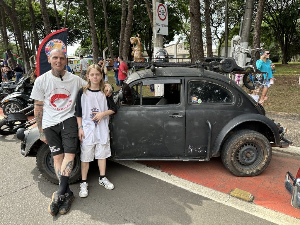 Ele relata que sempre recebe caveiras de pessoas e faz um apelo: “Quem quiser doar, ao ver meu carro na rua, é só amarrar na lataria”, comenta, rindo. No capô, ‘Camarão’ exibe o adesivo do moto clube ao qual pertence – Coisas da Estrada – e viaja com o carro para eventos da região junto com o grupo de amigos do Fusca, a ‘Família Pinga Óleo’. Ele mesmo faz os retoques na pintura da lataria com spray, uma habilidade que já repassou ao filho Victor – o ‘Camaraozin’, de apenas 12 anos.