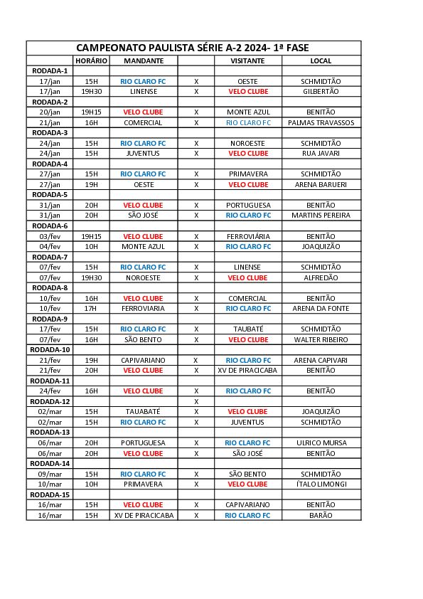 A Federação Paulista divulgou ontem (29) a tabela completa do Paulistão A-2 de 2024. O Rio Claro FC estreia no dia 17, às 15h, diante do Oeste no Schmidtão e o Velo Clube visita o Linense, às 19h, no Gilbertão em Lins. Jogam ainda dia 17, às 15h, Juventus x São Bento, Primavera x Portuguesa Santista e Monte Azul x Ferroviária. Mais tarde, o Capivariano recebe o Comercial, às 19h, São José e Noroeste jogam às 20h e Taubaté e XV de Piracicaba encerram a rodada às 20h15.