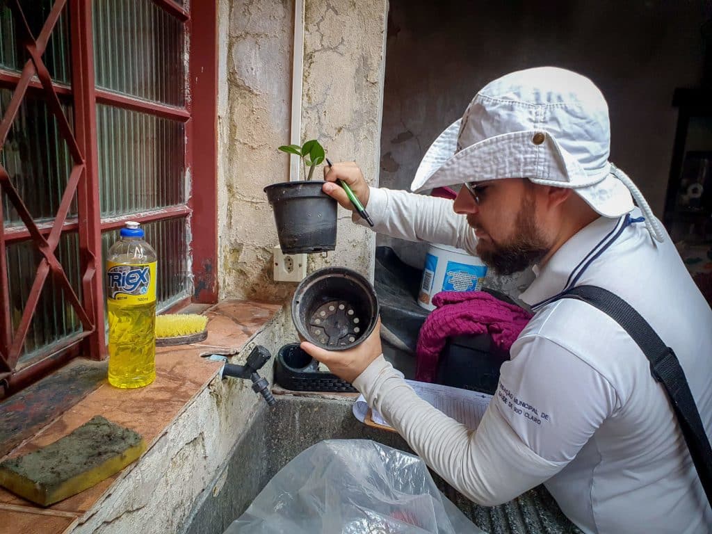 Agente de endemia fiscaliza possíveis focos da dengue e instrui moradores sobre como combater a doença. Foto: Divulgação/PMRC