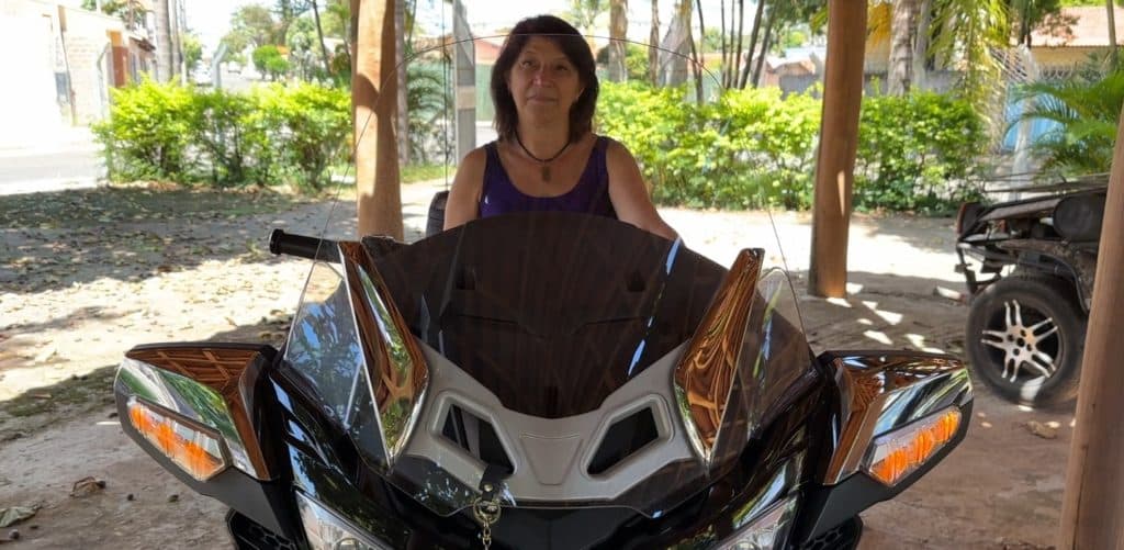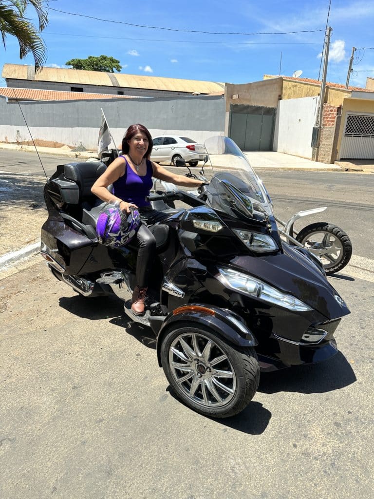 A técnica de enfermagem Magda Maria Bonaldo atua na área da saúde há 38 anos e tem uma grande paixão por motos. Recentemente, ela adquiriu um triciclo invertido da marca canadense Can-Am, o modelo Spider Limited ano 2013.