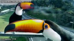 Tucanos pousam em frente à câmera de monitoramento de tráfego