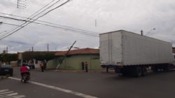 Caminhão derruba poste ao enroscar em fiação de telefonia