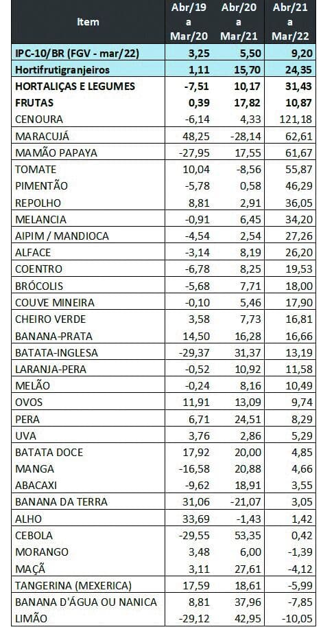 Um levantamento do Instituto Brasileiro de Economia (FGV IBRE) apurou que a inflação dos 31 itens hortifrutigranjeiros do IPC/FGV acumulou alta de 24,35% nos últimos 12 meses. A liderança ficou por conta das hortaliças e legumes, que aumentaram em média 31,43% no período, seguidos pelas frutas, com reajuste médio de 10,87%. O aumento foi quase o triplo da inflação média apurada pelo IPC-10/FGV (9,2%) – veja tabela completa ao lado.