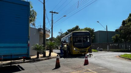 Caminhão e ônibus escolar colidem em rotatória no Jardim Floridiana