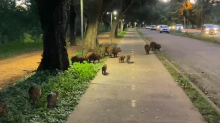 Portanto, a recomendação é não se aproximar muito quando se deparar com algum desses. No flagrante do leitor, havia cerca de 20 animais, incluindo filhotes, fazendo um passeio noturno.
