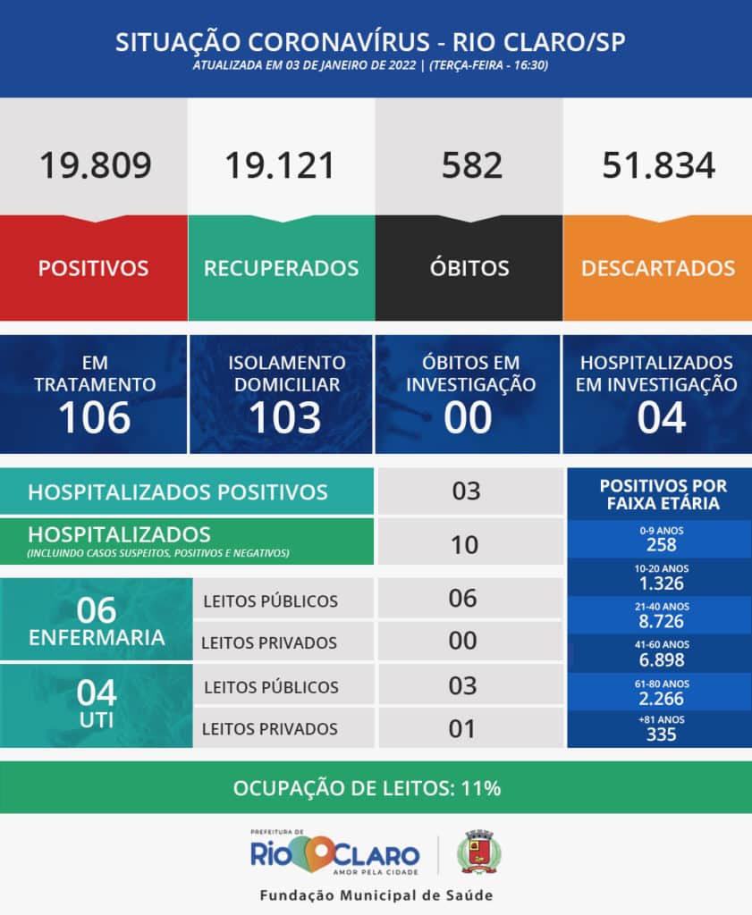 Boletim divulgado nesta segunda-feira (3) pela Fundação Municipal de Saúde aponta 30 novos casos de Covid em Rio Claro e total de 19.809. Entre os infectados nesta pandemia pelo coronavírus, 19.121 estão recuperados e 103 estão em isolamento domiciliar, sem sintomas ou com sintomas leves da doença.