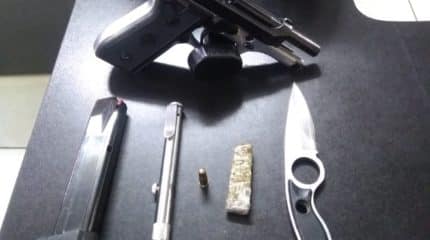 A Polícia Militar prendeu dois homens na Rua 6 com a Avenida 38, na Vila Operária, durante patrulhamento da Força Tática por porte ilegal de arma de fogo e porte de drogas. Segundo o boletim de ocorrência, um deles tentou se esconder dentro do veículo abordado no trecho. Na busca pessoal, foi localizado com o primeiro homem uma arma calibre .635, uma “arma-caneta”, municiada e uma faca. Já com o segundo rapaz nada de ilícito foi encontrado mas confessou que no veiculo que eles estavam havia uma pistola .380 com dois carregadores de sua propriedade, ambas armas sem numeração. No veiculo também foi encontrado uma porção de maconha. Ambos foram presos e levados ao plantão policial.