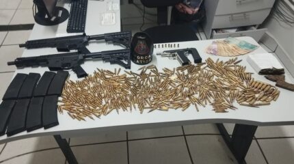 As investigações levaram à residência de outro suspeito, onde foram apreendidos dois fuzis, quase 500 munições, seis celulares, drogas com resultado positivo para maconha e um veículo HB20 azul com placa adulterada, registrado como furto em Santo André. Durante a abordagem, uma mulher tentou destruir um dos celulares, mas foi impedida pelos policiais.