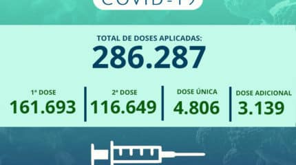 Nesta sexta-feira o município aplicou 2.154 doses de imunizante. O total de doses aplicadas desde o início da campanha de vacinação é de 286.287, sendo 161.693 primeiras doses, 116.649 segundas doses, 4.806 doses únicas e 3.139 doses adicionais (terceiras doses).