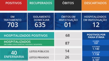 De segunda-feira para a terça-feira a ocupação de leitos subiu de 47% para 50%. Com isso, são confirmadas 87 hospitalizadas, sendo que 47 estão em UTI e 40 em enfermaria. Os números incluem dados das redes de saúde pública e privada. Desse total, 12 ainda também aguardam o resultado dos exames.