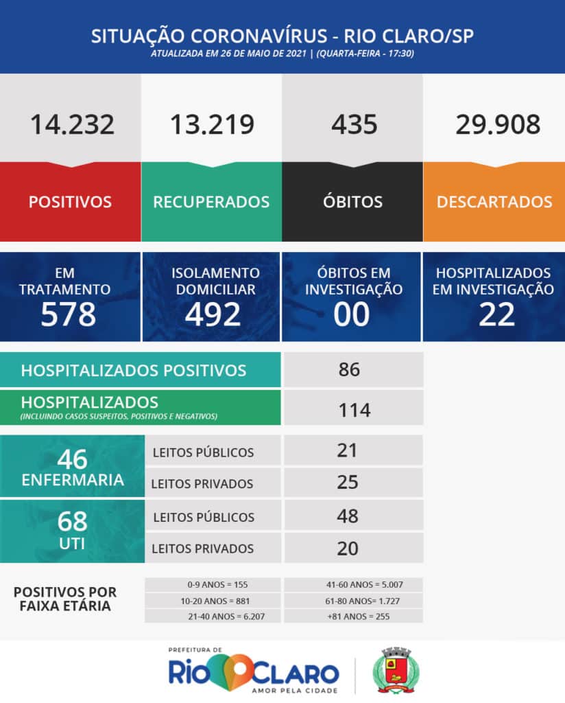 Rio Claro tem 435 óbitos e 68 pacientes em UTI por Covid