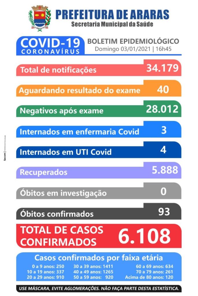 Segundo o último balanço epidemiológico, Araras registra 6.108 casos confirmados da doença provocada pelo novo coronavírus (Sars-CoV-2).