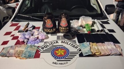 Na garagem haviam mais dois indivíduos esses já conhecidos nos meios policiais por tráfico de drogas. Um deles dispensou uma pequena garrafa plástica contendo entorpecentes sendo apreendidos um total de 307 eppendofs de cocaína, vários apetrechos para embalo de drogas, balanças de precisão e R$ 2.972,00 em cédulas diversas além de cinco aparelhos celulares de marcas diversas.