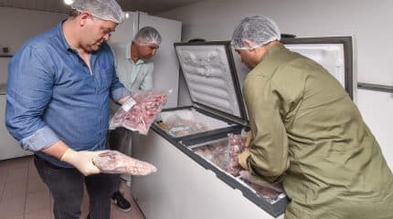 O prefeito João Teixeira Junior assinou na terça-feira (7) decreto autorizando a doação de sete toneladas de carnes que estavam destinadas à alimentação escolar para que sejam utilizadas no atendimento social realizado pelo município. “Com o prolongamento da suspensão das aulas decidida nesta semana, devido à pandemia do coronavírus, tomamos a decisão de fazer esse alimento chegar àqueles que mais necessitam”, explica o prefeito. “Além de afastar o risco de desperdício, essa decisão também deverá ajudar várias famílias neste momento tão difícil para todos nós”, acrescenta Juninho, que na terça-feira esteve com o secretário municipal da Educação, Adriano Moreira, e o diretor do departamento de Alimentação Escolar, Mário Veiga, conferindo parte da carne que será doada.