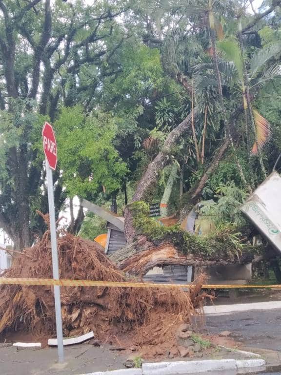 Os estragos causados pela chuva continuam a aparecer na noite deste sábado (4). Pelo menos duas quedas de árvores foram registradas no município.