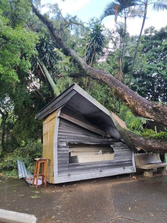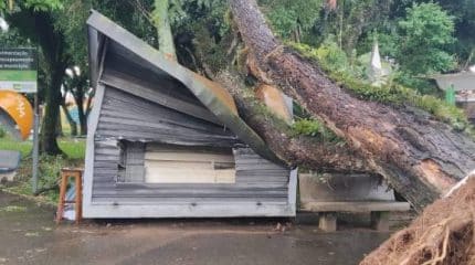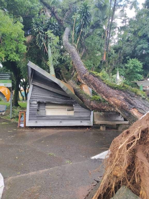 Uma árvore de grande porte caiu sobre uma banca de jornal na esquina entre a Rua 9 e a Avenida 30, no Bairro Santana, em decorrência do vento e da chuva forte na noite deste sábado (4).