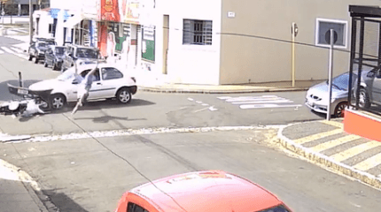 Um motociclista ficou ferido após ser atingido por um veículo no cruzamento da Rua 7 com a Avenida 8. Imagens de câmeras mostraram quando o condutor de um veículo Fiesta avança o sinal de “Pare”. É neste momento que acontece a colisão com o motociclista que estava em uma Honda Biz. Moradores e comerciantes afirmam que acidentes no local são comuns.