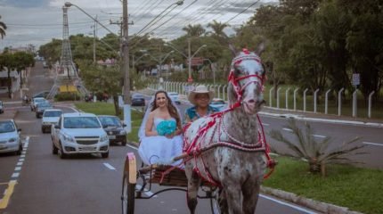 “Eu e Danilo já estávamos noivos, nos conhecemos através de amigos em comum e, como somos cristãos, ele pediu a minha mão para o pastor da igreja, pois meu pai já é falecido. Passávamos pela Avenida 29 e vi seo Paçoca com sua charrete e comentei que gostaria de chegar ao casamento dessa maneira, pois sempre gostei muito de animais e meu pai incentivou esse amor desde que eu era criança”, conta.