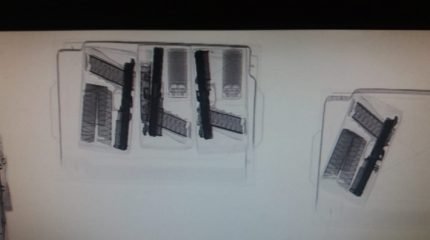 Durante fiscalização de rotina nas bagagens despachadas, foram localizados “objetos metálicos em uma mala”. Identificado o viajante, a mala foi aberta e, dentro dela, as armas foram encontradas escondidas em embalagem de perfumes.