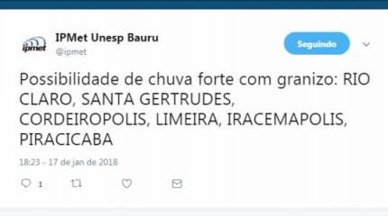 O IPMet – Centro de Meteorologia de Bauru, localizado na Unesp daquele município, publicou às 18h23 desta quarta-feira (17) que o seu sistema de radar indicou a possibilidade de chuva forte com granizo nas cidades de Rio Claro, Santa Gertrudes, Cordeirópolis, Limeira, Iracemápolis e Piracicaba nos próximos minutos.