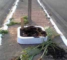 Menos de dois meses após serem plantadas por alunos da Escola Municipal Luiz Martins Rodrigues Filho, aproximadamente 15 palmeiras imperiais foram destruídas em ato de vandalismo na madrugada deste sábado (12), na Avenida Castelo Branco. As plantas foram arrancadas e jogadas no meio da avenida, onde quase todas terminaram esmagadas pelos carros.
