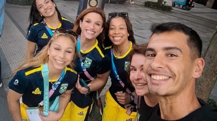 O ultramaratonista estava pela Avenue des Champs-Élysées, uma das mais famosas da capital francesa, quando se deparou com Flávia Saraiva, Lorrane Oliveira e Jade Barbosa, trio que ao lado de Rebeca Andrade e Júlia Soares foi medalha de bronze por equipes na semana passada.