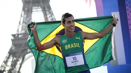 Caio Bonfim já havia se aproximado da medalha nos Jogos Rio 2016, quando terminou a prova da marcha na quarta posição, até então o melhor resultado para o Brasil na prova. Em Londres (2012), sua estreia olímpica, ele passou mal e não completou o percurso. E em Tóquio (2021), o brasiliense terminou na 13ª colocação. O marchador também tem no currículo duas medalhas de bronze em mundiais de atletismo (2017 e 2023), além de três medalhas na prova individual em Jogos Pan-Americanos (prata em 2019 e 2023, bronze em 2013). receber a medalha de prata
