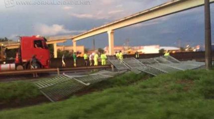 Com a forte chuva que atingiu a região no final da tarde deste domingo de Natal (25), a grade de proteção de uma passarela localizada na Rodovia Washington Luiz, trecho próximo a Santa Gertrudes, caiu sobre a pista. Segundo informações da concessionária Centrovias, o sentido Norte da via em direção ao interior, já está liberado. No sentido sul, em direção a capital, o trecho ainda está interrompido e há congestionamento no local, sendo que os carros estão sendo desviados pelas marginais. A concessionária confirmou que o tráfego deve ser liberado completamente até o final da noite. Não houve feridos.