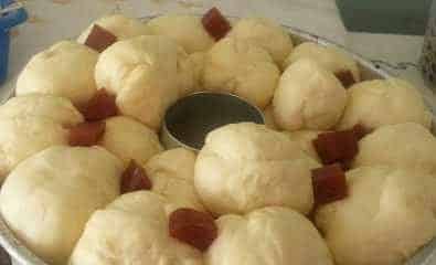 Bata no liquidificador os ovos, o fermento, o óleo e o iogurte (ou o leite); despeje em uma tigela e acrescente o trigo, o sal e o açúcar e amasse muito bem. Caso seja necessário, coloque mais trigo. Faça pequenas bolinhas com a massa e coloque no meio delas pedaços de goiabada cascão; depois as deposite em uma forma redonda com buraco no meio.