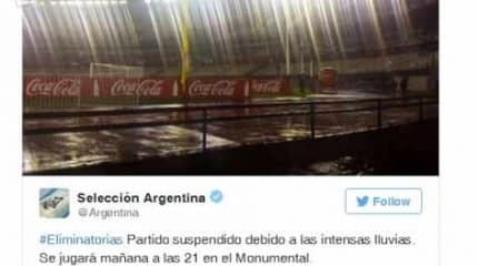 Por causa das fortes chuvas que atingiram Buenos Aires nesta quinta-feira (12), a partida entre Argentina e Brasil foi adiada para as 22h (de Brasília) de sexta-feira (13). A informação foi dada pela AFA (Associação de Futebol Argentino) e depois confirmada também pela CBF (Confederação Brasileira de Futebol).