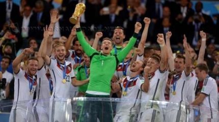 Manuel Neuer, eleito melhor goleiro da Copa, levanta a taça de campeão na Copa do Mundo (Lars Baron/FIFA/Getty Images)