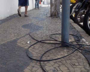 É só prestar atenção nos postes brevemente para encontrar em alguns deles fiação enrolada e espalhada pelo chão. Como às vezes esses cabos e fios não estão visivelmente cortados, mas conectados ao topo do poste, a situação gera insegurança: como saber se estão energizados?