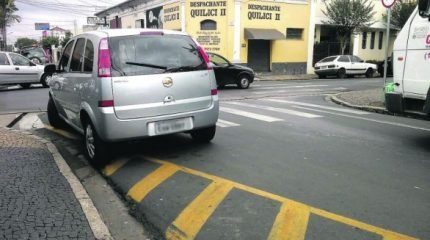 O desrespeito às leis de trânsito pode ser facilmente observado em várias ruas da área central de Rio Claro. Na foto, um carro estacionou em cima de uma faixa de pedestres e em parte de uma sinalização de proibido estacionar.