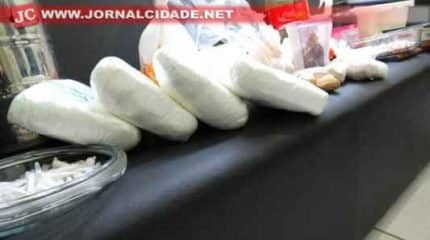 Foram apreendidas 350 pedras de crack, 70 eppendorfs de cocaína, 250 gramas de cocaína, 83 gramas de maconha e 7 kg de um pó branco ainda não examinado. Além da droga, foi encontrado equipamento e material para refino de cocaína.