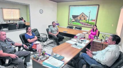 Dando continuidade aos trabalhos que já estão sendo realizados para aumentar a segurança nas escolas, foi realizada na manhã de quarta-feira (12) uma reunião entre o prefeito Lázaro Noé da Silva (Gino), o sargento Pires, da Polícia Militar, o secretário municipal de Segurança, Ricardo Picceli, a secretária de Educação, Marina Duarte Cattae Lima, e a superintendente administrativa Aline Carlevaro.