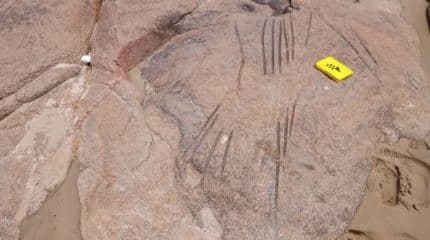 Na viagem, Alessandretti, que é professor do Instituto de Geografia da Universidade Federal de Uberlândia, de fato encontrou rochas que chamaram sua atenção porque exibiam certos traços, como se tivessem sido marcadas com ferramentas muito potentes. “A rocha que aflora ali é um tipo especial de granito. Parece muito com esse granito que vemos nas pias. É uma rocha muito dura, muito difícil de riscar. E, junto a isso, apareceram essas feições erosivas muito marcadas em um ponto específico da praia”, conta Warren.