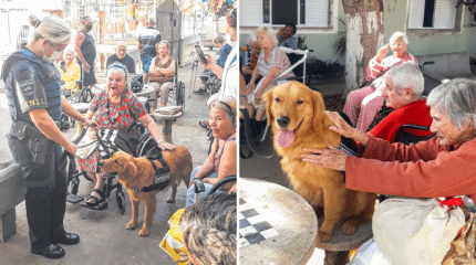 Na visita mais recente, idosos da Hospedaria de Emaús, localizada na Avenida 22, bairro Santana, foram presenteados com a chegada da equipe do Canil (GCM Rafael e GCMF Cortes) da Guarda Civil Municipal que levaram o cão de faro Holly.
