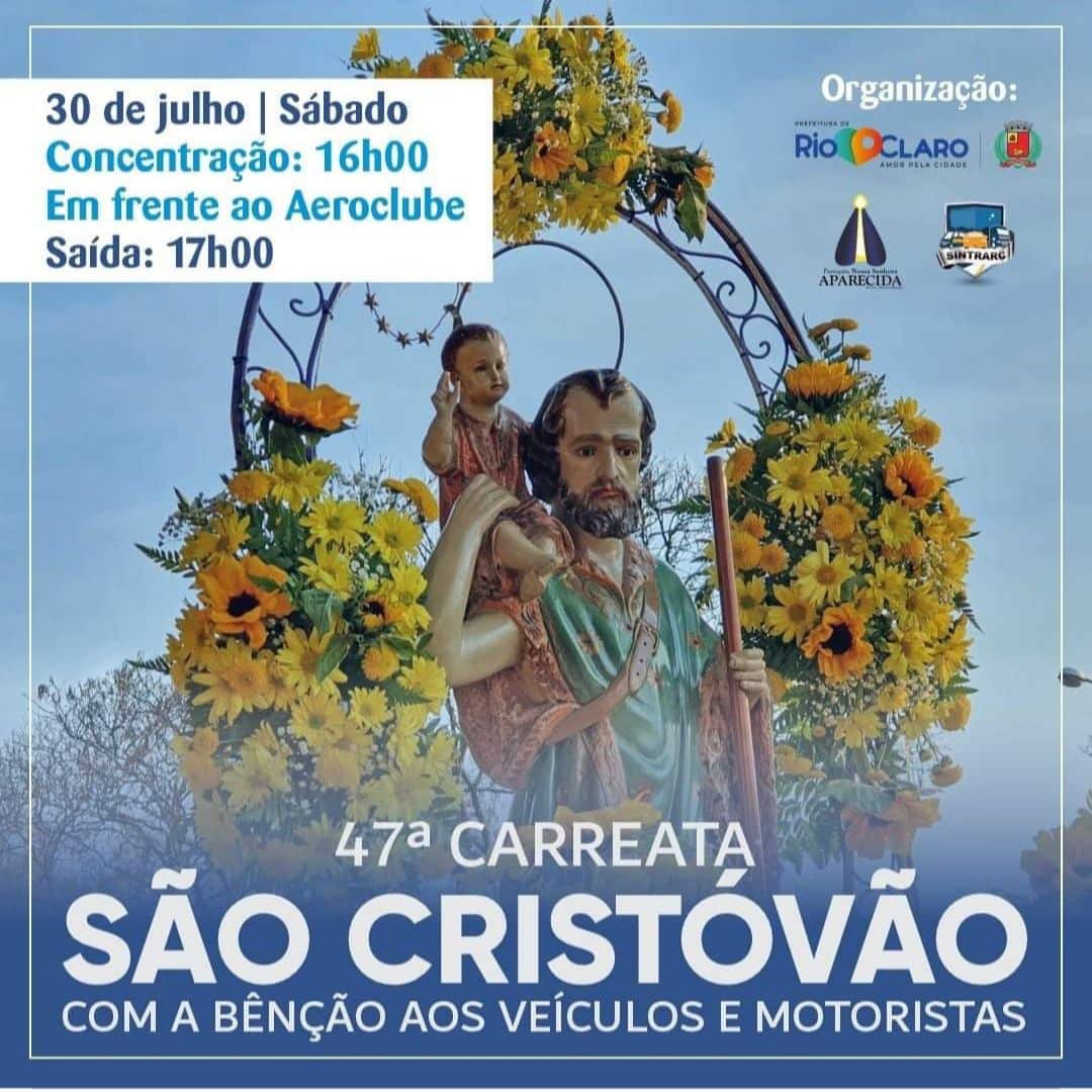 Dia 30 de julho de 2022 acontecerá em Rio Claro a tradicional carreata de São Cristóvão – Padroeiro dos motoristas, com a bênção do Padre Renato Luís Andreatto da Paróquia Nossa Senhora Aparecida de Rio Claro.