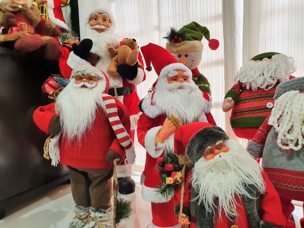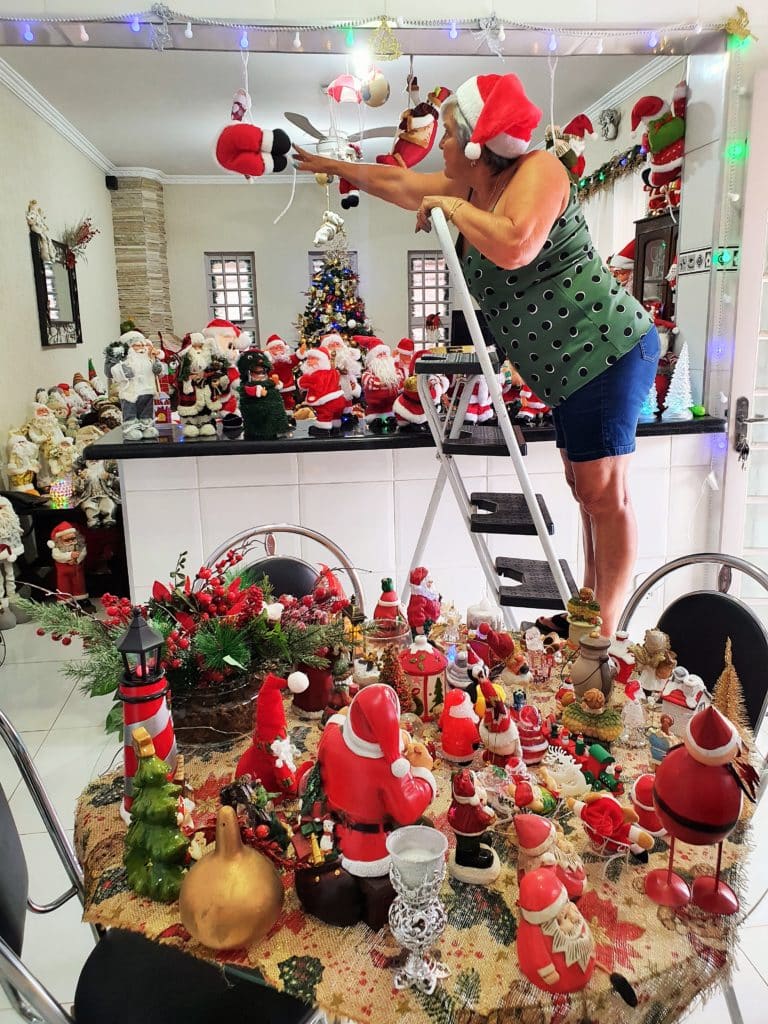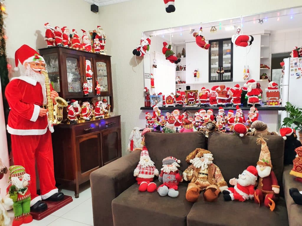 Tem peças de tudo quanto é jeito no chão da sala, em cima das mesas, no sofá, armários e até dentro da lareira. A figura mais popular do Natal aparece de várias formas: dançando, tocando violão, guitarra, bateria, batendo sinos, subindo escadas. E tem até o papai noel de férias.