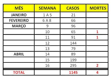 Segundo as estatísticas, a cidade registrou até a última sexta-feira 1.145 casos confirmados, uma média de 71 casos por semana, o que são quase 10 casos diários. A região sul está negativamente se destacando neste cenário, com os bairros Jardim Novo 1 (168 casos) e Jardim Novo 2 (53 casos) entre os que mais estão registrando casos da doença neste ano. Somente em abril, até o momento, foram registrados mais casos do que nos três primeiros meses do ano.
