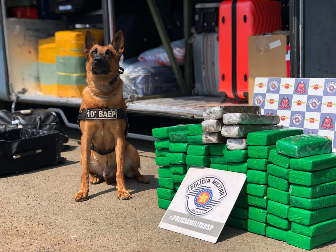 A ação que tem como objetivo coibir o transporte clandestino, infrações de trânsito e tráfico drogas, abordou um ônibus que seguia de São Paulo para o Maranhão. Em verificação com o cão de faro THOR, foram localizados em duas malas diversos tijolos de maconha.