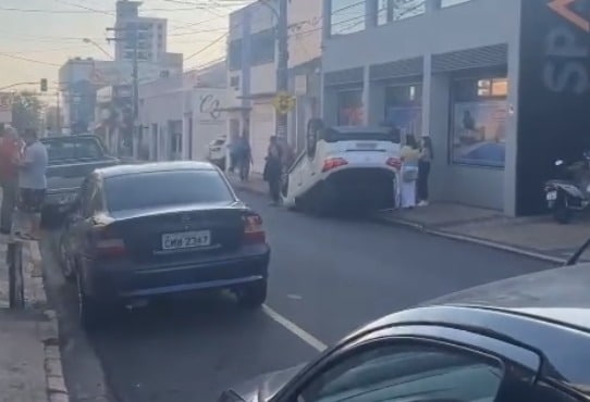 Um veículo acabou capotando na Avenida 6 entre as Ruas 1 e 2. A cena chamou a atenção de comerciantes e pessoas que passavam pelo local que é bastante movimentado.