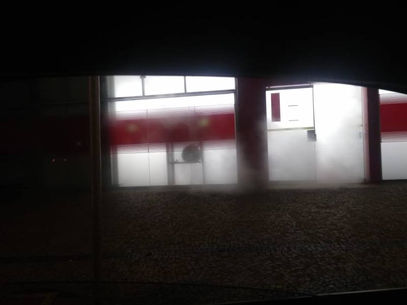 O banco, que fica ao lado do Jardim Público, está novamente com uma nuvem de fumaça branca no seu interior, que teria sido motivada após acionamento do sistema e alarme de segurança.