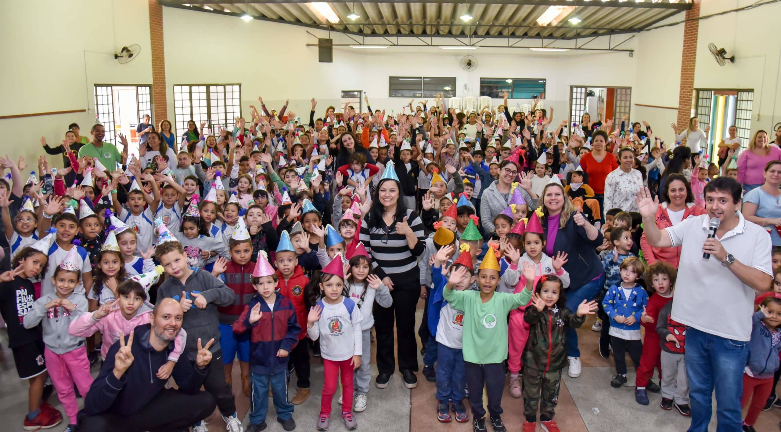 Os quase 800 alunos levaram pratos para um piquenique, cantaram o hino da escola, o Parabéns Pra Você e se confraternizaram nos celebrando os 43 anos da escola.